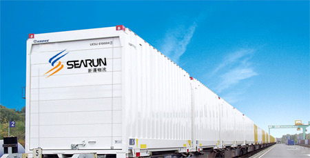 标志取"SEARUN"的首写字母"S"作为主体,形似一条向上无限伸延的路,意取新运蒸蒸